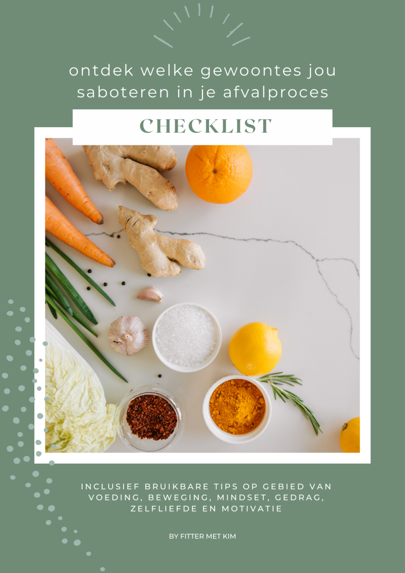 Download hier de gratis checklist, waarmee je kan ontdekken welke gewoontes jouw afvalproces saboteren. Inclusief praktische tips die je meteen kan toepassen op gebied van voeding, beweging, mindset, gewoontes, motivatie en zelfliefde.