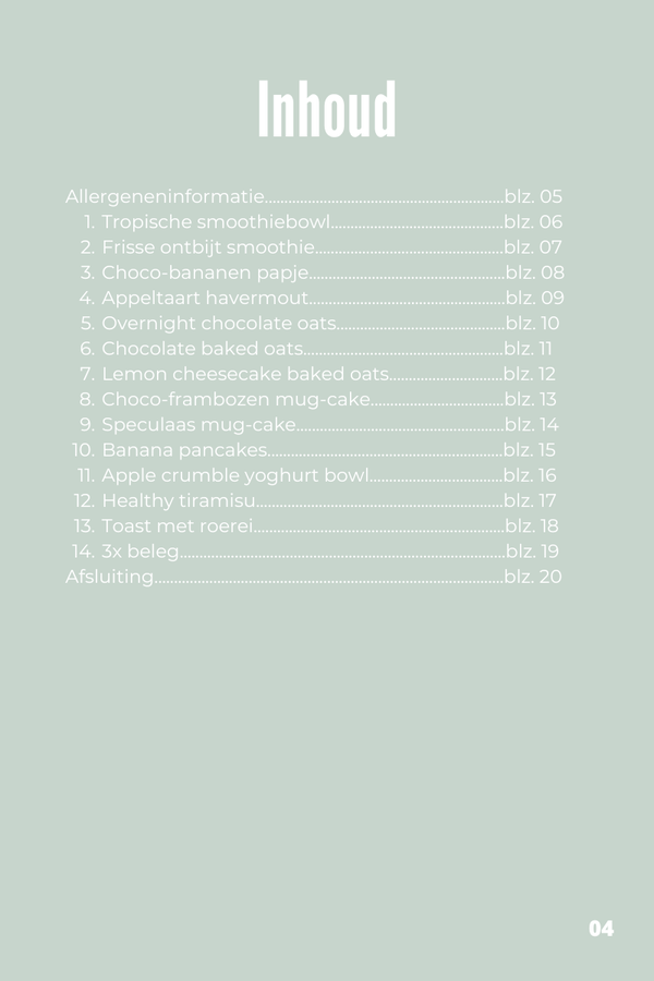In dit e-book ontdek je 14 eenvoudige en smaakvolle ontbijtrecepten, inclusief vegan, lactosevrije en glutenvrije opties. Perfect voor iedereen die gezond wil eten zonder gedoe!